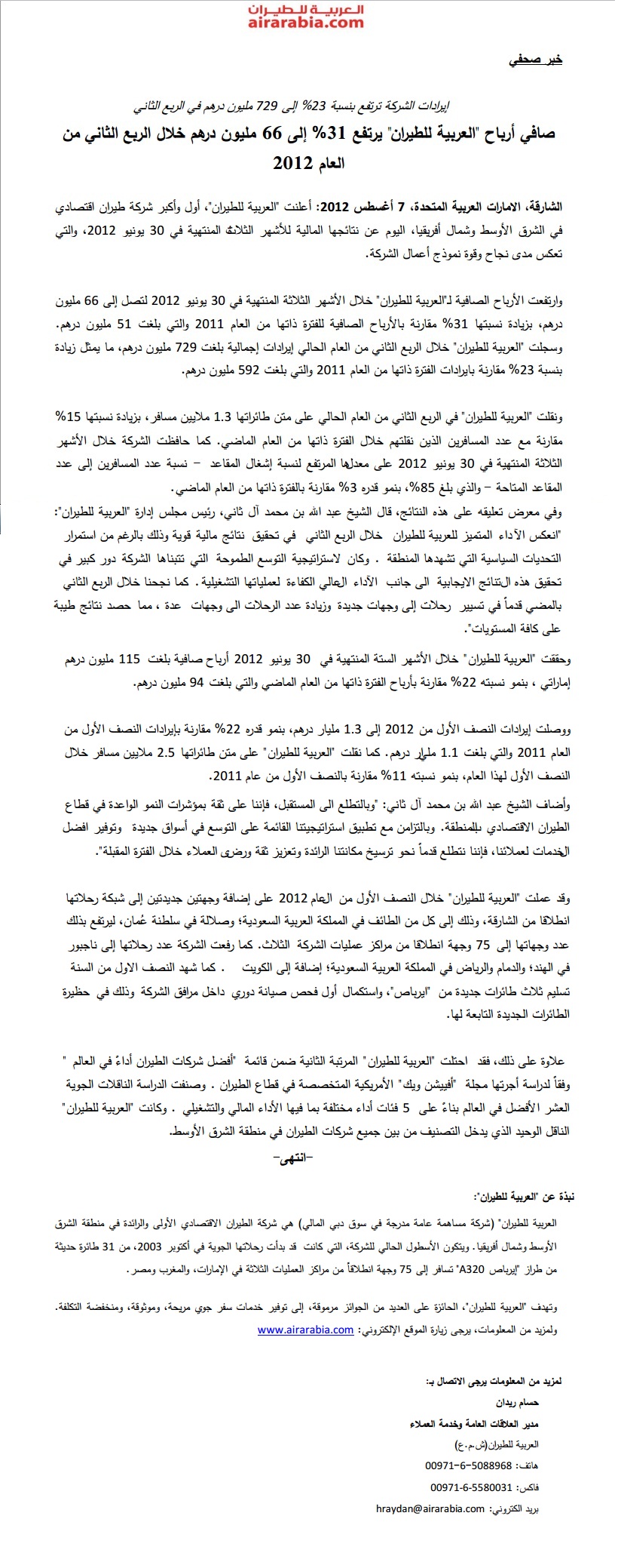 ارتفعت الأرباح الصافية لـ”العربية للطيران” خلال الربع الثاني من 2012 لتصل إلى 66 مليون درهم، بزيادة نسبتها 31% مقارنة بالأرباح الصافية للفترة ذاتها من العام 2011 والتي بلغت 51 مليون درهم.